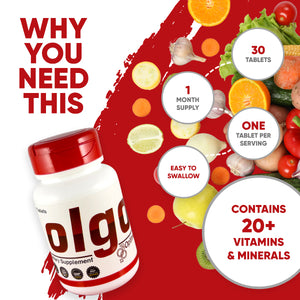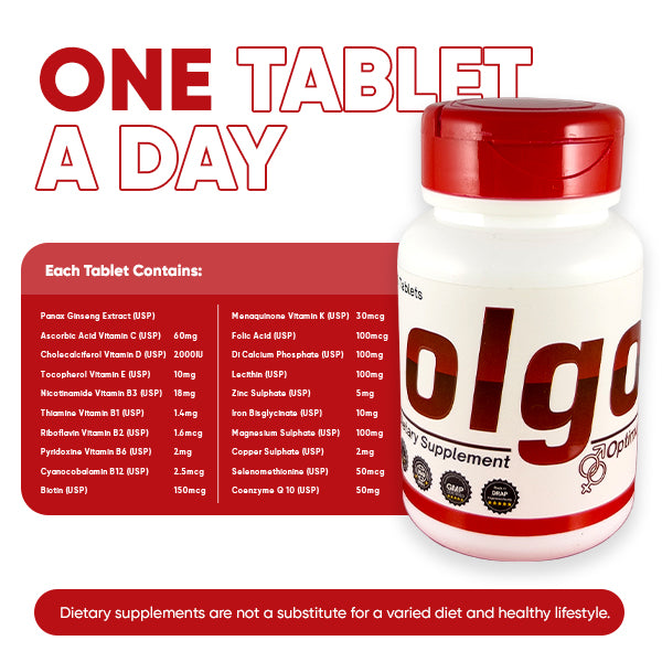 OLGO is a complete daily multivitamin formulated with essential vitamins, minerals, Coenzyme Q10, and Panax Ginseng. It’s ideal for adults who want to support energy levels, immunity, mental focus, and overall wellness, especially those with busy or active lifestyles.