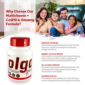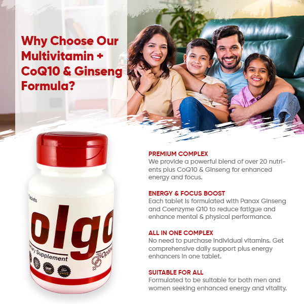 Olgo is a premium multivitamin blend enriched with Coenzyme Q10 and Panax Ginseng, designed to support overall health, boost daily energy, enhance mental focus, and promote cardiovascular and immune function. With a powerful mix of essential vitamins, minerals, and antioxidants, Olgo is your daily nutritional partner for vitality and performance.